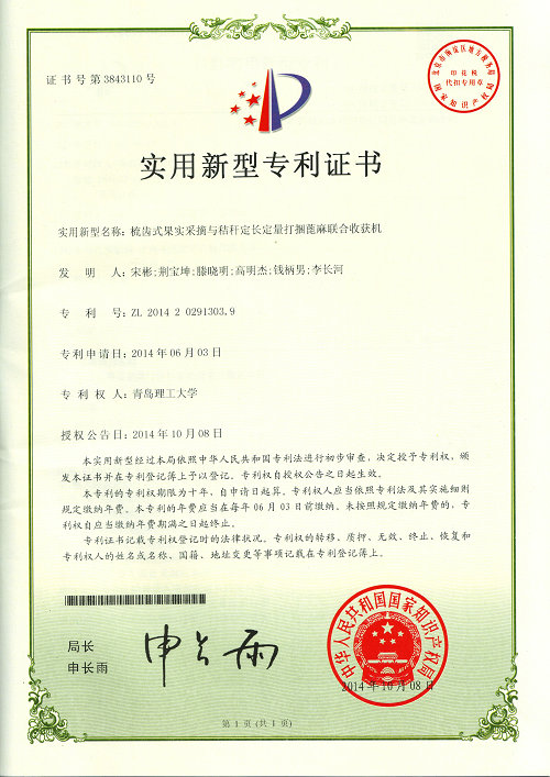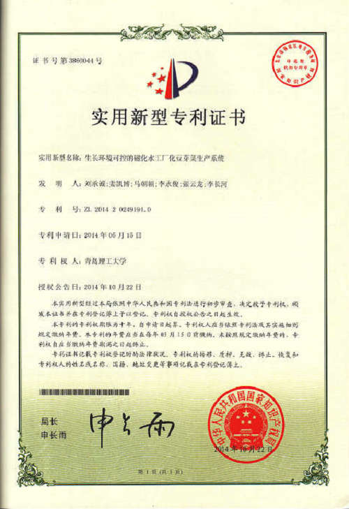 其中,机械116班刘承诚等同学申请的实用新型国家专利(指导教师:李长河)获得国家知识产权局授权,专利名称为生长环境可控的磁化水工厂化豆芽菜生产系统,专利号为201420249191.0。该发明是一种集洗豆、量豆、温度控制、臭氧杀毒、磁化水浇豆、麦饭石净水等一系列功能于一体的生长环境可控的磁化水工厂化豆芽菜生产系统。本发明能够自动清洗豆子;自动监测和控制控制豆芽菜生产单元、加热水箱和制冷水箱温度;选装臭氧机,杀菌消毒;独立设置淋水时间和淋水次数,为豆芽生长营造一个最适宜可控的生长环境,从而生产出健康无公害的优质豆芽。机械117班荆宝坤等同学申请的实用新型国家专利(指导教师:李长河)获得国家知识产权局授权,专利名称为梳齿式果实采摘与秸秆定长定量打捆蓖麻联合收获机,专利号为201420291303.9。该发明提供一种梳齿式果实采摘与秸秆定长定量打捆蓖麻联合收获机,集蓖麻籽的采摘、分离、清选和秸秆的定长切段、定量压实、自动打捆、自动出捆等功能于一体。该机器使用方便,能够连续高密度作业,机械化程度高,收获效率高,降低人工生产强度,提高了资源综合利用率,为农作物秸秆的深加工利用提供了可靠的设备保障,推广了蓖麻产业的广阔前景。