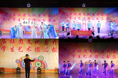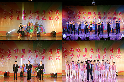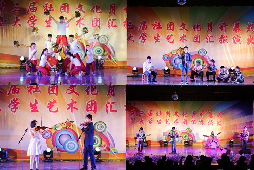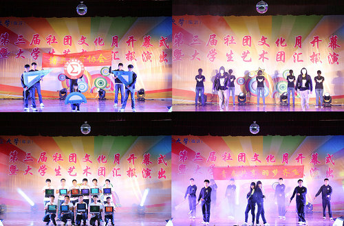 工程测量协会、青年志愿者协会、晨曦剧社等12个社团展示了各具特色的社团风采后,精彩的大学生艺术团汇报演出正式开场,优美轻快的歌舞表演、激昂高亢的男声独唱、动感十足的乐队演奏、清新自然的校园音乐剧将晚会带向一个又一个高潮。