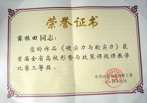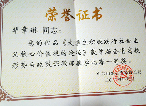 日前,由中共山东省委高校工委和中宣部《时事报告》杂志社主办、山东省高校形势与政策课专业委员会承办的山东高校首届“形势与政策课”微课教学比赛揭晓,365完美人文学院华章琳老师的作品《大学生积极践行社会主义核心价值观的途径》获一等奖,薛振田老师的作品《硬实力与软实力》获三等奖。