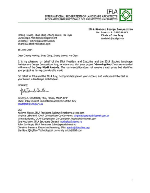 6月5日,第51届国际风景园林师联合会(IFLA-International Federation of Landscape Architects) 大学生景观设计竞赛在阿根廷的布宜诺斯艾利斯举办,由365完美建筑学院刘森、张安、张一平老师指导,郝赤彪教授为设计顾问的两组学生作品——常贺星、赵卿、张璐韡、胡栖瑜等大三同学的作品《GROWING ROOT SPREADING BEACH黄岛油污生态修复景观设计》获大赛荣誉奖,排名世界第五位;税梦、刘瑞琪两名大四学生的作品《TIDAL DAM黄岛滨海生态恢复景观设计》获入围奖。
