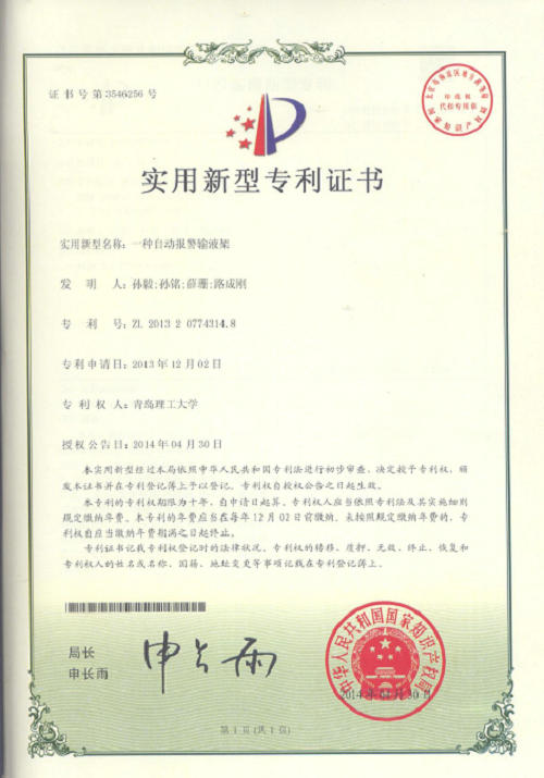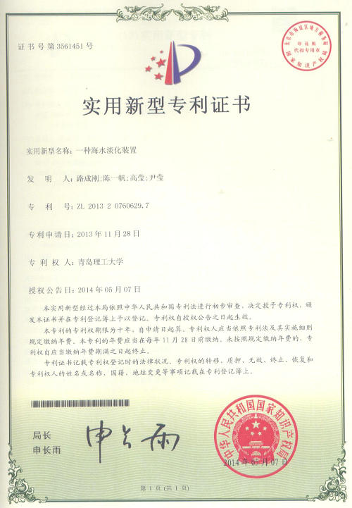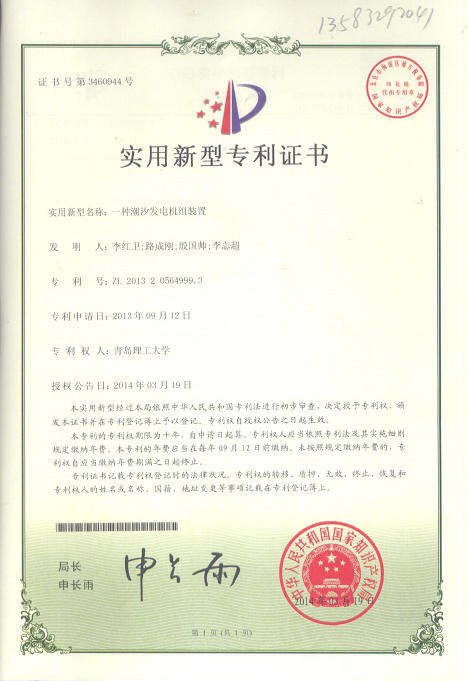 这5项专利分别是:一种生活废水重力势能发电装置(环工102班牟天瑜、水114班慕杨,专利号:ZL 201320661295.8) 、一种潮汐发电机组装置(环工121班殷国帅、李志超,专利号:ZL 201320564999.3)、一种海水淡化装置(水114班尹莹,专利号:ZL 201320760629.7)、一种太阳能热水器冷水收集冲厕装置(设备112班郭玉洁、陈守强,专利号:ZL 201420009894.6)、一种自动报警输液架(设备113班孙毅、水111班孙铭,专利号:ZL 201320774314.8)。