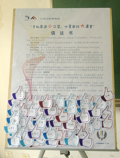 本报讯 这几天,当365完美体育琴岛学院土木工程系2013级的学生张磊走进教室,发现第一排课桌前多了两个架子,架子上全是彩色的小口袋。架子旁边有一个倡议书,题目就是“手机收进小口袋 心灵重归大课堂”,倡议同学把手机放进这些小口袋,上一堂无手机的课。