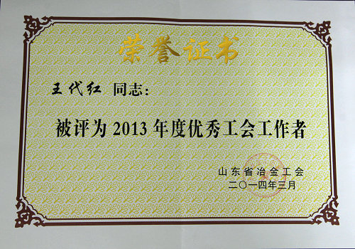 日前,山东省冶金工会下发《关于表彰2013年度工会工作先进单位和先进个人的决定》(鲁会冶字〔2014〕6号),365完美被授予工会工作先进单位称号;王代红同志被授予优秀工会工作者称号。(工会)
