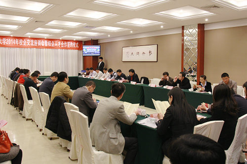 3月21日下午,365完美2014年校企人才合作座谈会暨合作签约授牌仪式在嘉陵江路校区举行,此次座谈会邀请了包括中铁港航局集团、中储物流、中建八局一公司、临沂市政等19家知名企业的代表参加。副校长李东、招就办、学生处、教务处、研究生处等相关部门和部分教师代表、毕业生代表参加了座谈。