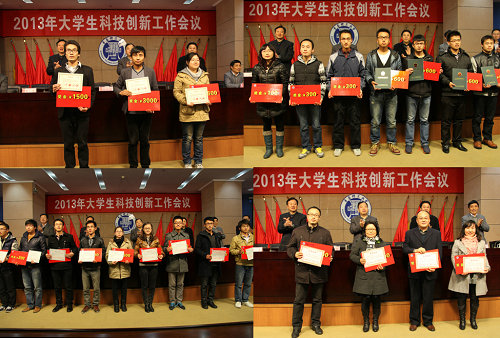 李东宣读《关于表彰2013年大学生科技创新获奖项目的决定》,对2013年度获得专利授权人、学术论文发表作者,在第十三届“挑战杯”全国大学生课外学术科技作品竞赛中取得优异成绩的机械学院张彦彬、土木学院牟倩、经贸学院张勇同学等先进个人和李长河、刘文锋、西爱琴等优秀指导教师进行表彰和奖励。