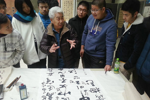 开幕式结束后,靳元浩先生等参观了书画展,他对同学们的书法作品给予了肯定,并对大学生在现场书写的几幅作品进行了指导,并题字“明德惟馨”留念。