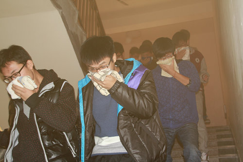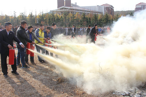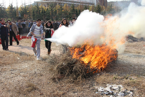 本次演练包括宿舍自救互救、紧急逃生和扑灭初起火灾三项内容。自救互救环节,同学们在5分钟之内迅速地把床单连在一起打成结,绑在宿舍的固定物体上扔出窗外,并用湿毛巾堵住门窗,以便同学们在十分紧急的情况下能够迅速逃生。在第二道警报响起后,第二项内容紧急逃生开始。同学们都用湿毛巾捂住口鼻,在浓浓的烟雾中井然有序的从公寓里跑出,在楼下工作人员的指导下向操场疏散。到达操场后,各班长清点人数并向领导汇报。在工作人员的组织下,同学们分组进行了第三项训练——扑灭初起火灾。首先由消防员点燃草地上的火源,然后在消防员的指导下第一、二组同学拿着铲子和扫帚冲上去迅速将大火扑灭。紧接着第三、四组同学拿着灭火器上前灭火,在同学们熟练的操作下,大火随即被熄灭。之后大二、大三、大四、公寓职工以及莅临现场的各位领导、老师依次进行了灭火演练。最后,学生处副处长李忠晓总结本次演练,他指出此次火灾(地震)自救逃生演练领导高度重视、同学们积极配合,取得了理想的效果。通过演练增强了大家的安全意识,提高了师生的自我保护能力,为学校的安全管理工作做出了应有贡献。