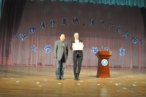 经过激烈角逐,并通过评委团的认真公正评选,管理学院代表曹雪梅以97.6的高分勇夺冠;外国语学院代表贾秀艳、土木学院代表卢东哲、人文学院代表赵灿荣获二等奖,艺术学院代表毕赛男等六位选手荣获三等奖,商学院代表石婧婧等六位选手荣获优秀奖。