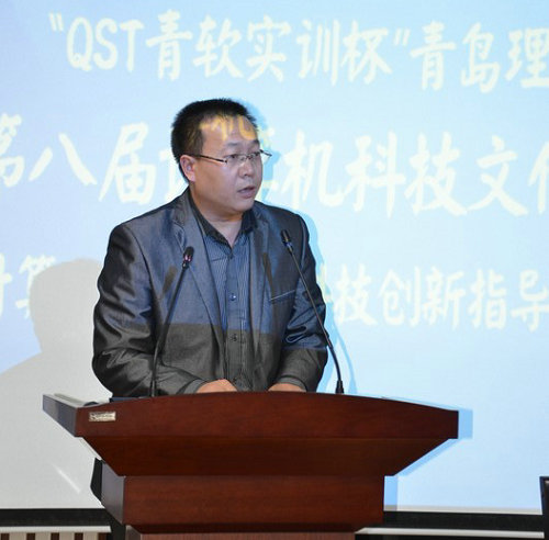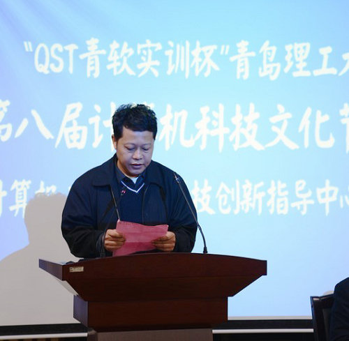 王斌在致辞中说,一年一度的计算机科技文化节已成为学校校园文化建设的品牌项目,是对广大学生进行素质教育与创新教育的有效载体。王斌介绍了学院近年来取得的科技创新成果,并对文化节的方案进行了简单介绍。青软实训QST感知教育集团总经理、董事李战军先生作为协办单位代表致辞。软件104班班长、科技创新标兵矫恒超同学发言。