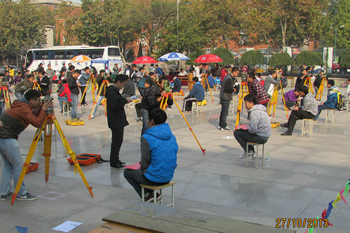 本次测量大赛共有来自土木学院和环境学院的53组选手参加,比赛采用轮赛制,每一轮有21组同时比赛,按测量耗时及结果精确度来计算成绩。参赛队抽签决定测点,检查仪器无误后方可正式进行比赛。比赛竞争十分激烈,参赛选手操作娴熟、配合默契,展示了当代大学生的良好的工程技能水平和团队合作精神。