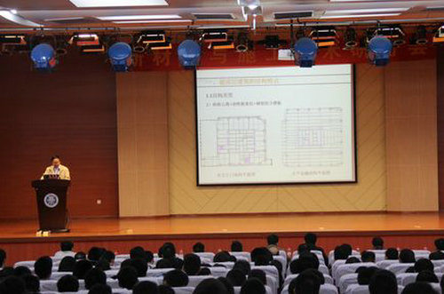 朱毅敏研究员结合“上海中心”和“东方之门”等项目,对超限、超高层建筑施工技术就其结构形式、竖向变形补偿计算、混凝土泵送设计、整体提升钢结构平台设计及应用、塔吊设计原则等多方面进行了详细阐述;姜志浩研究员对超高建筑结构中梁式转换层吊挂式施工和如何将桥梁施工中的贝雷梁施工技术引入巨型装换梁施工原理及计算分析做专题报告;土建工程系刘将讲师和刘运生讲师就土建工程系承担的产学研项目—“基于FRCP的PVC复合塑料模板的开发和应用”及“新型规格化钢结构支撑体系试验研究与工程应用”,汇报了研究及应用进展。各位汇报人与校区广大师生进行了现场交流。全体与会人员于16日赴日照市对土建工程系主持的两个产学研项目进行了现场观摩。