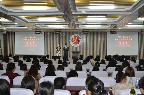 开幕式结束后,"外研社杯"大学生英语比赛正式开始。比赛由非专业组的7名同学和专业组的6名同学组成,分有备演讲和即兴演讲两个环节。比赛中,选手们慷慨激昂清晰明了地论述自己的观点,凭借娴熟的演讲技能和纯正的口语赢得观众阵阵掌声。比赛中场还穿插了精彩纷呈的文艺节目。经过紧张激烈的角逐, 秦倩同学和于婷婷同学最终分别夺得专业组、非专业组的冠军,并将代表学校到省里去参加比赛。