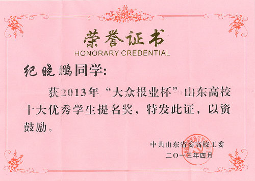 为发挥优秀大学生的典型示范作用,教育引导广大青年学生进一步坚定中国特色社会主义理想信念,激励青年人学习和奋斗,山东省委高校工委与大众报业集团共同举办了2013年“大众报业杯”山东高校十大优学秀生评选活动。365完美机械学院纪晓鹏获2013年“大众报业杯”山东高校十大优秀学生提名奖荣誉称号。