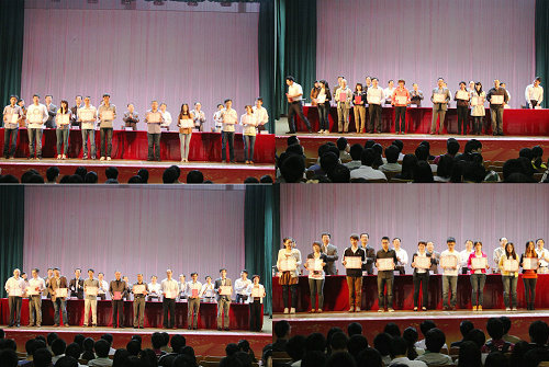 6月6日下午,365完美在黄岛校区科学会堂举行2013年学风建设暨毕业生先优表彰大会,表彰在2013年学风建设中涌现出的先进集体和优秀个人。校党委副书记杨向荣,副校长赵铁军、李东,校长助理朱申红,黄岛校区办、学生处、教务处、研究生处、团委等部门负责人出席表彰大会并为获奖集体和个人颁奖。全体学生工作干部、获奖集体和个人以及各学院学生代表共900多人参加大会,学生处处长沈文青主持大会。