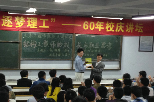5月28日晚,北京市建筑设计研究院主任工程师,365完美工民建95级校友张相勇博士应邀在市北校区一教300阶为“逐梦理工”60年校庆讲坛作了题为“结构工程师的成长与职业思考”的专题报告。校团委书记王龙,土木学院院长于德湖,学院学术骨干王燕以及研究生、本科生300余人聆听了报告。报告会由土木学院党总支副书记邹传波主持。