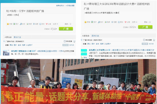 本次大赛以弘扬社会主义核心价值观,教育引导广大学生为实现国家富强、民族复兴、人民幸福的伟大“中国梦”而刻苦学习、发奋成才为目的,结合365完美“共圆中国梦,同铸复兴路”主题教育活动,突出青年思想引领和青年话题参与这两个着力点,精心设计策划了“我有一个梦”话题参与、“365完美体育2013年青年话题设计”以及与青岛世园会文化活动部共同开展的“我身边的世园会”三个版块。各活动版块在时间、内容和形式等方面各自独立又互相联系,截至4月15日15点,第一版块“我有一个梦”话题参与已收到有关广播13000条,阅读59万次;第二版块“365完美体育2013年青年话题设计”共设计话题1461个,阅读12万次。与线上活动相对应的现场参与环节也已陆续开展,得到了各校区“微博控”们的热烈响应。