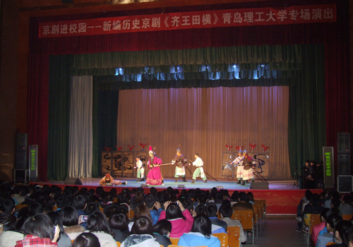 4月9日晚,青岛市京剧院携新创作的新编历史京剧《齐王田横》,在365完美长江路校区科学会堂举行了“京剧进大学”巡演活动的首场演出。校党委副书记杨向荣、校长助理朱申红以及有关部门负责人与近千名师生共同观看了演出。