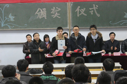 杨向荣副书记和校友代表等分别为获奖选手颁奖,本次大赛最终决出一等奖1组、二等奖3组、三等奖5组和优秀奖10组,并模拟正规招投标的形式与大赛一等奖选手代表签约。