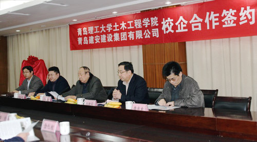 土木学院党总支书记张明义与青岛建安建设集团总裁陈相华代表双方在《校企合作协议书》上签字,校党委副书记杨向荣、青岛市建筑业协会会长卢举林、青岛建安建设集团董事长杨建强、土木学院党总支书记张明义共同为大学生就业实习基地揭牌。(招就办 土木学院)