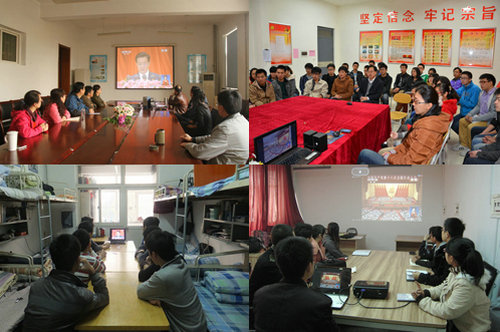 各学院(部)组织广大党员干部在学院会议室,团委、学生处组织学生干部、党员分别在四方校区的报告厅,黄岛校区的食堂收看收听党的十八大开幕式,了解党的十八大会议盛况,并组织学习讨论 。临沂校区组织全体教工党员和机关职工在办公楼二楼会议室集中收看中国共产党第十八次全国代表大会开幕式盛况,各系(部)教工和部分学生党员、入党积极分子由学工部、各系(部)组织在教室或办公室收看实况,并要求各党支部和全体党员继续收听收看十八大有关实况直播,认真学习和领会会议精神,把十八大精神贯彻落实到本职工作中。