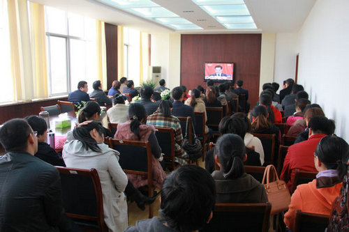 临沂校区全体教工党员、机关职工在会议室集中收看