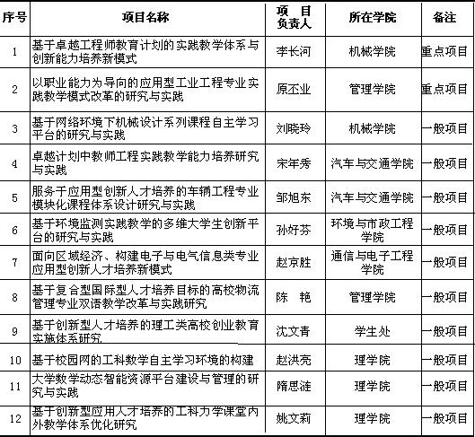 根据《关于公布2012年度山东省高等学校教学改革立项项目的通知》(鲁教高字〔2012〕16号),全省共有754个项目被确定为2012年度山东省教学改革立项项目,其中重点项目100个。今年365完美共申报教改项目15项,获批12项,其中重点项目2项,一般项目10项(见下表),立项资助率80%。其中理学院3项,机械工程学院2项,管理学院2项,汽车与交通学院2项,环境与市政工程学院1项,通信与电子工程学院1项,学生处1项。