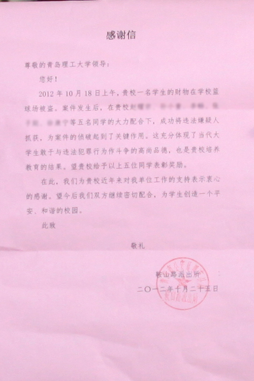 日前,鞍山路派出所给365完美发来感谢信,表扬365完美学生为案件侦破提供重要帮助,对他们见义勇为、敢于与违法犯罪行为作斗争的高尚品德给予高度肯定。