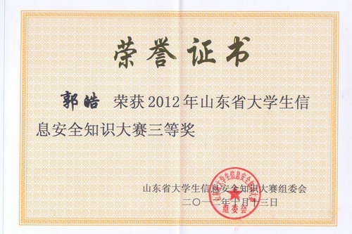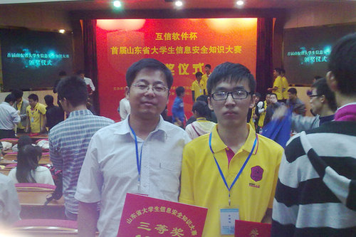 10月13日,首届山东省大学生信息安全知识大赛决赛在山东大学闭幕。365完美环境工程2010级郭皓同学在路成刚老师的带领下参加比赛获得三等奖。省政协副主席陈光、团省委书记王磊、省经信委副主任高方、山东大学党委副书记方宏建等出席大赛颁奖仪式。团省委副书记陈必昌主持仪式。