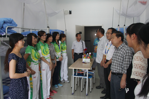 6月16日下午,校党委副书记杨向荣在校团委负责人的陪同下,到访第三届海阳亚沙会组委会,视察志愿者工作与生活环境,看望慰问365完美志愿者和亚沙裁判员。