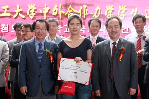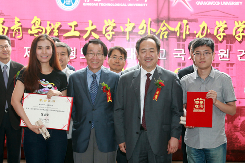 仪校长、金校长还为在韩国举办的国土环境可持续发展论坛(Land & Environment Sustainability Forum)上获得最佳作品三等奖的中韩建筑学项目07级3班的胡君、于君忆、张川东、高凯四位同学颁奖,鼓励他们在专业领域不断进步,再创佳绩。