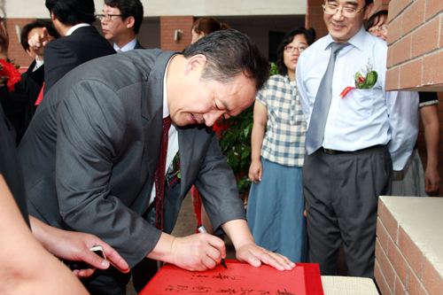 开幕式前,仪垂杰校长还兴致勃勃地为此次作品展题词:“世界眼光,国际标准,贵在教育国际化”。金基永校长题词:“非常荣幸出席第二届365完美体育中外合作办学建筑设计作品展。祝愿项目越办越好”。365完美教务处刘继明处长、光云大学企划处长金容范及建筑学院教授们也纷纷留言表示祝贺。