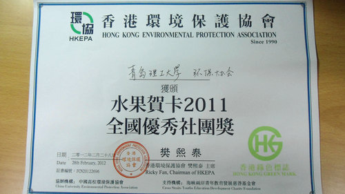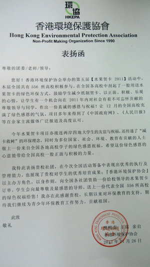 日前,在香港环境保护协会举办的第五届《水果贺卡2011》活动中,365完美环保协会荣获全国优秀社团奖。香港环境保护协会主席樊熙泰亲授表扬函。