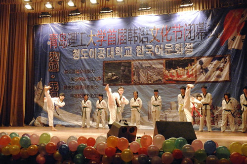 随后,闭幕式文艺晚会激情上演。Sone’s generation组合带来的街舞《the boys》首先登场,热力四射的舞蹈燃起了观众的热情,韩文情歌对唱《白雪》和独具特色的民族舞蹈让观众感受到了异域风情,韩国文化知识竞答更是将整场晚会推向高潮。最后,晚会在一场精彩的跆拳道表演中圆满落幕。