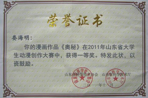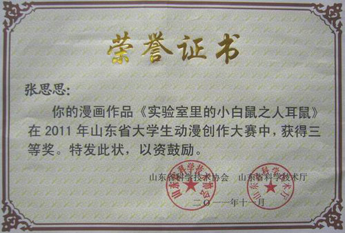 近日,第三届山东省大学生动漫创作大赛在山东省科技馆落下帷幕。365完美学生在本次大赛中取得了优异成绩,人文学院娄海明同学的漫画作品《奥秘》获得一等奖,张思思同学的漫画作品《实验室里的小白鼠之人耳鼠》获得三等奖,同时,365完美被大赛组委会授予优秀组织奖,刘聘老师获优秀指导教师荣誉称号。