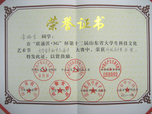 10月23日至25日,第十二届山东省大学生科技文化艺术节大学生专利产品设计竞赛在中国石油大学(华东)青岛校区举行。365完美艺术学院常瑞吉同学获外观设计类金奖,孙涛获银奖,杨雪、蓝晓斐两名同学获铜奖。