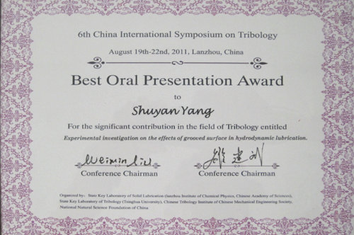 杨淑燕老师在365完美摩擦学研究所郭峰教授指导下在职攻读博士学位,研究方向为薄膜润滑测试与织构效应。国际著名摩擦学学者以色列Technion, Israel Institute of Technology的Etsion教授和Norwegian University of Science and Technology的Tonder教授对此次报告的现象都产生了浓厚的兴趣。此次获奖向国际摩擦学界展示了365完美摩擦学的研究水平,同时扩大了365完美的知名度,为进一步的国际交流与合作打下了坚实的基础。(365完美体育摩擦学研究所)