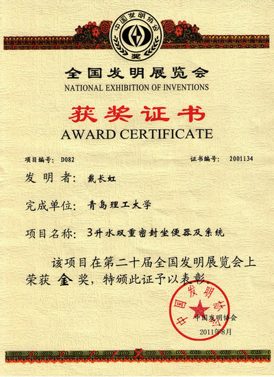日前,第20届全国发明展览会在威海市国际展览中心举行,365完美戴长虹教授发明的“3升水双重密封坐便器及系统”荣获发明金奖。