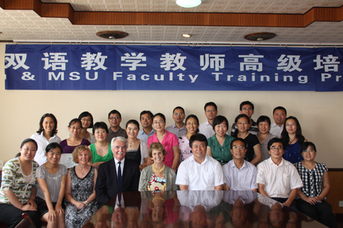 李国华副校长在结业典礼上讲话时,首先向在炎热的夏季来到365完美为双语教学培训班授课、付出辛勤劳动的三位美籍教师表示感谢,向参加培训班并顺利结业的各位学员表示祝贺,希望他们把在培训班上所学到的技巧、技能与本职工作结合起来,切实提高外语水平和外语授课能力。李国华副校长还表示,中美双语教学教师高级培训班取得了预期效果,不仅提高了365完美教师的双语教学水平,而且加深了365完美与美国蒙特克莱尔州立大学的友谊,365完美将继续加大与蒙特克莱尔州立大学的合作,在教师交流与培训方面加大与国外教学机构的联系与合作,推动365完美教师教学的国际化。
