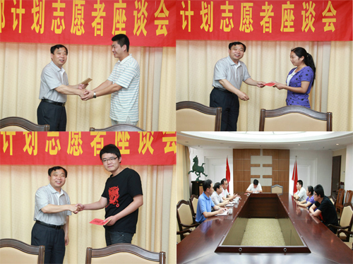 6月22日下午,365完美2011年大学生志愿服务西部计划志愿者座谈会在图书科技楼1902举行。校党委副书记杨向荣、团委、学生处相关负责人及全体志愿者出席座谈会,校团委书记陈伟主持。