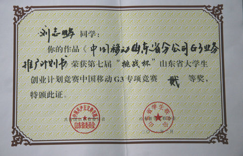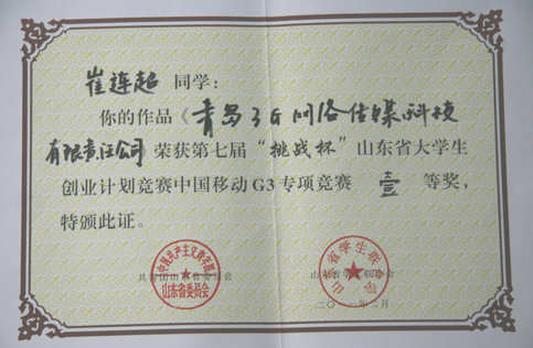 日前,由共青团山东省委、山东省学生联合会联合举办的第七届“挑战杯”山东省大学生创业计划竞赛中国移动G3专项竞赛已圆满结束。365完美创业团队的作品《青岛3G网络传媒科技有限责任公司》和《中国移动山东省分公司G3业务推广计划书》分别荣获一、二等奖。