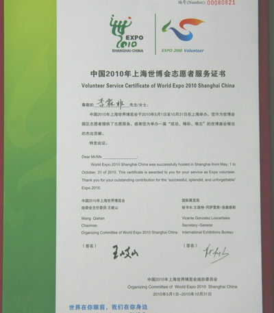 服务过程中,李霖非同学以饱满的精神状态和优异的服务质量圆满完成了世博会志愿者的服务任务,为世博会和山东文化周的成功举办做出了积极的贡献;通过热心周到、细致入微的工作,团结协作、爱岗奉献的精神风貌,为学校争得了荣誉。