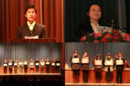 12月21、22日,学校在四方、黄岛两校区分别召开了2009-2010学年学生先优表彰大会,隆重表彰和奖励在一学年的学习、工作中取得优异成绩的先进集体和先优个人。校党委副书记杨向荣,副校长赵铁军、李东,校长助理朱申红等学校领导出席会议,教务处、团委、各学院负责人在主席台就座,并为获奖集体和个人颁奖。学生处处长沈文青主持会议。