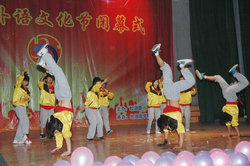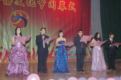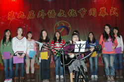闭幕式上,来自外国语学院6位老师的诗歌朗诵《逝去的青春—My lost youth》,声情并茂,淋漓尽致地展现出老师们的个性风采,将晚会掀起一个高潮。朝鲜语外教及学生们的歌伴舞更是令人耳目一新,清新自然的表演别致动人。外文歌曲决赛中,八位选手可谓八仙过海,各显神通,为观众献上了一场视听盛宴,会场不时爆发出阵阵掌声。