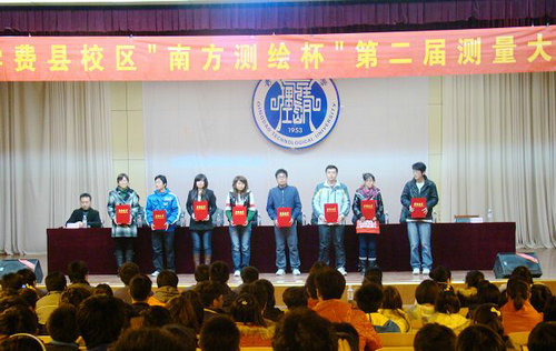 11月16日晚,费县校区第二届“南方测绘杯”测量大赛闭幕式暨颁奖典礼在学术报告厅举行,费县校区副校长朱卫东、南方测绘公司临沂分公司经理王彦军、校区教务部主任李祥城、工程管理系主任荀志远、土建工程系副主任苗吉军和学工部、团委负责人出席典礼并为获奖选手颁奖。