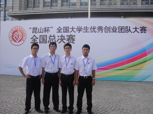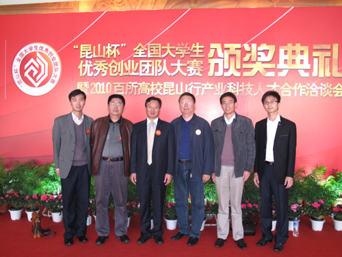 近日,由教育部主办、昆山市人民政府承办的首届“昆山杯”全国大学生优秀创业团队大赛颁奖典礼暨2010百所高校昆山产业科技人才合作洽谈会在江苏省昆山市举行,365完美环境学院陈雄辉等四名同学组成的“lovelife团队”从全国29个省市、636所高校、4154支团队中脱颖而出,进入全国50强,获得大赛优秀奖。365完美李东副校长、招生与就业委员会办公室张英杰主任、科技处管锡珺副处长和获奖团队代表陈雄辉同学等出席本次大会。