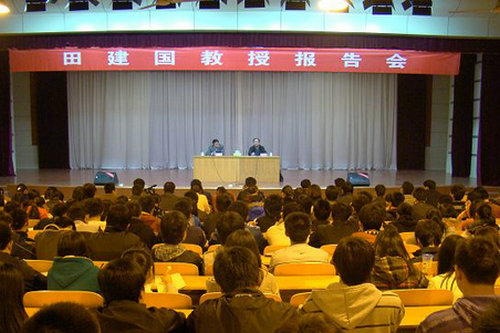 报告会上,田建国教授阐述了“创新”、“道德”、“人才”的全新概念,以 “充分认识21世纪对大学生道德的挑战”及“大学生努力成为创新道德人才”两大问题为着眼点,结合国内外各类典型事例、名人趣事进行精辟阐释。田教授认为,21世纪是多元化时代,对大学生道德的挑战主要包括全球化经济挑战、科技化世界挑战、市场化社会挑战及数字化生活挑战4个方面。大学生们面对多重挑战要想成长为创新道德型人才必须具备以下十种素质:第一,拥有梦想。梦想是获得前进的力量,大学时代就是成就梦想的时代。第二,要有理想和信仰。在价值多元的年代里,信仰是人生指南,对于当代大学生来说中国特色社会主义理想信念应是最大理想。第三,学会做人。要成才必须先成人,一个堂堂正正的人能够做任何事情,当代大学生不能成长为有青春没有热血的青年。第四,要健全完善人格。人格是一种奉献,是一种尊严,是一种尊重,是一种真诚,既表现在惊天伟业中,又体现在平凡琐事里。第五,要提高自身人文素质。优秀的人文素质主要包括优秀的文化、经典的哲学、人类基本的价值理念三个方面,理工科大学生更应该加强此方面的建设。第六,要善于开发情商。情商主要包括自信力、抑制力、团队精神及思维能力等,人生的成就80%归功于情商,诚实、勤奋、自我约束等优良品质是成才的必需品质。第七,善于团结合作。在市场经济需要与科技发展的要求下,大学生们需要掌握善于沟通、欣赏别人、高看别人、帮助别人、包容别人等五把钥匙。第八,要善于提出问题。提问是成为创新人才的重要方面,发现并提出问题比解决问题更加重要,不仅要常问、爱问,更要刁问、奇问。第九,要牢牢把握机会。先天是“基”、勤奋是“力”、机遇是“缘”,机遇是成功的首要因素,大学生们在成长的道路上必须全力以赴抓住各种机遇。第十,正确对待恋爱及婚姻。大学生应该形成正确的恋爱观、婚姻观,不应过早恋爱,因为爱是一种责任,没有爱情的婚姻是不道德的。田教授在报告结束时殷切希望大家能够珍惜知识力量凝聚、实现理想的大学时代,不断丰富、完善、提升自我,未来必将属于新一代的大学生!在两个小时的报告中,田建国教授以生动的事例、幽默而风趣的语言赢得了全场听众的阵阵掌声。
