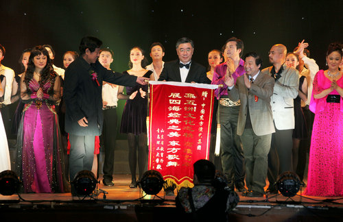 山东省教育厅体育卫生与艺术教育处处长张德珠和365完美体育党委副书记杨向荣向东方演艺集团赠送锦旗,东方演艺集团总经理顾欣向365完美体育赠送礼品,各位领导、嘉宾上台与艺术家们合影留念。