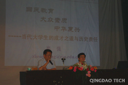 报告会上,郑强教授围绕“国民教育、大众素质、中华复兴”三个方面深入浅出地阐述了当代大学生的成才之道与历史责任问题。他深入分析了“中学奥赛”、“幼儿园教育”、“中国足球与诺贝尔奖”、“教育究竟应该为谁服务”等现象和问题,提出“教育是把双刃剑”,“好的教育让人睿智,反之,让人愚昧”的论断。郑强教授联系自身的成长成才经历,教育广大青年学生要多受“磨练”,结合自己的经历指出“成才必须经历艰苦磨练”的人生哲理。他强调,“国富不等于民强”,“没有民族凝聚力、国家就没有力量”,“民族文化是民族精神的根基、民族语言是民族文化的根本”,要求大学生树立正确的世界观、价值观和人生观,要爱祖国、爱家乡、爱学校、爱父母。他向大家提出十五条“强哥语录”,富于哲理,引人深思。此外,他用“科学有国界,科学家更有他的祖国”警醒同学们要爱自己的祖国、学校以及父母。最后,郑强教授还给观众播放了他在浙江大学新年音乐会中的一段歌唱视频,向同学们展现了他在声乐方面的成就。报告会结束时全体同学起立长时间鼓掌,对郑强教授精彩纷呈的演讲表示感谢。