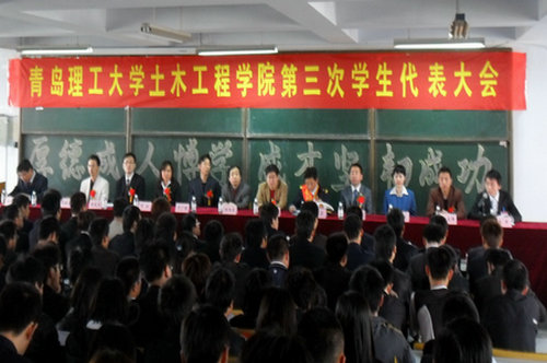 5月9日下午2:30,以“厚德成人,博学成才,坚韧成功”为主题的土木学院第三次学生代表大会在一教300阶召开。校党委副书记杨向荣,团委副书记王龙,土木学院院长于广明、党总支书记刘健、副书记宋玲、团总支书记高洁、建筑学院团总支书记谢春虎、校学生会主席乔中、高职学院、机械学院学生会主席、全国劳动模范王炳交、青岛市演讲与口才协会会长侯希平等出席大会。会议由土木学院学生会主席魏代龙主持。