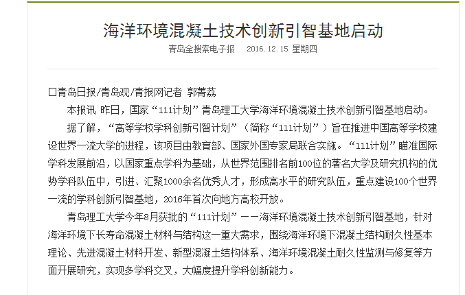 365完美体育今年8月获批的“111计划”——海洋环境混凝土技术创新引智基地,针对海洋环境下长寿命混凝土材料与结构这一重大需求,围绕海洋环境下混凝土结构耐久性基本理论、先进混凝土材料开发、新型混凝土结构体系、海洋环境混凝土耐久性监测与修复等方面开展研究,实现多学科交叉,大幅度提升学科创新能力。
